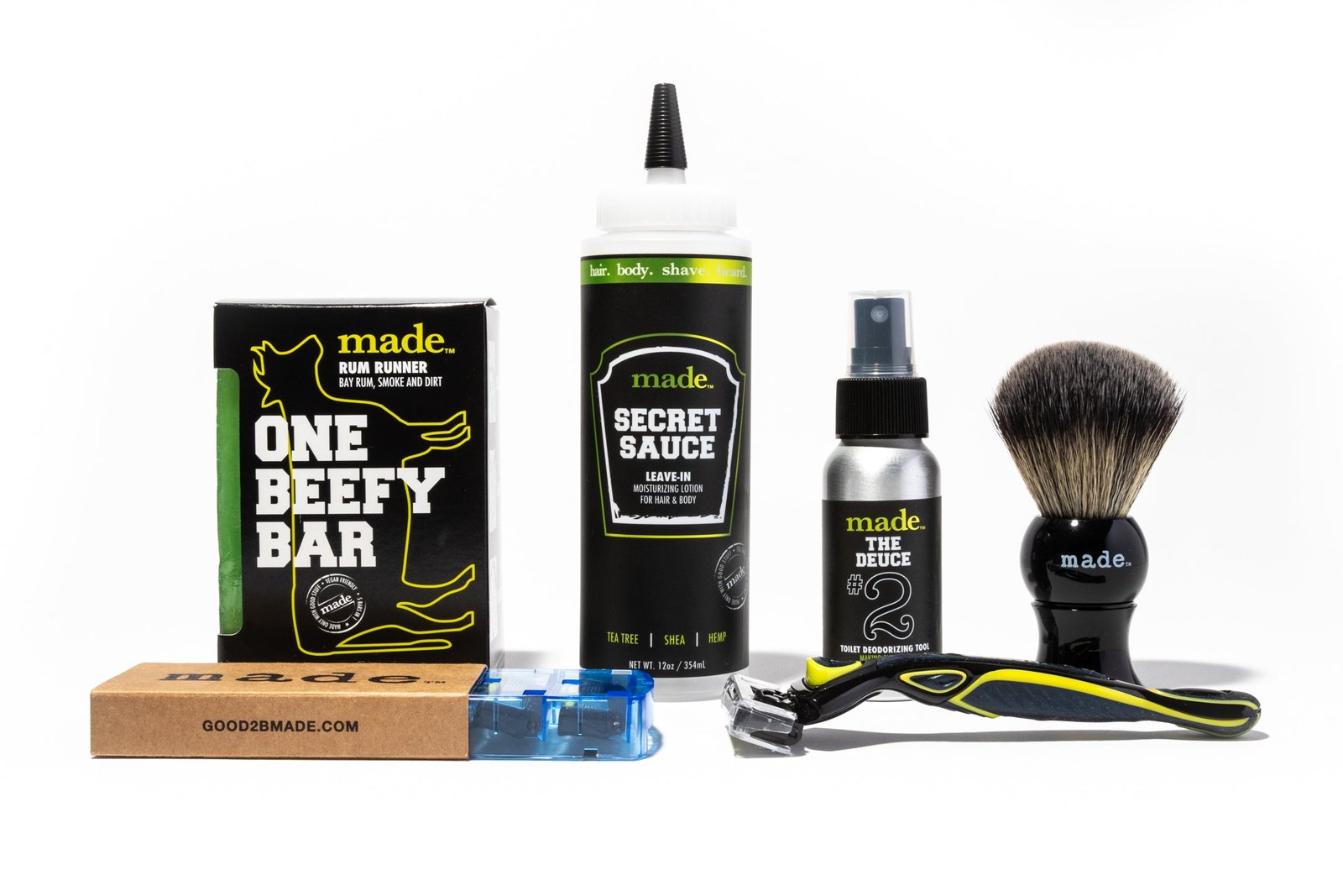 Everything for the ultimate personal and environmentally safe bathroom. In recognition for the person you are, here is everything you need including your choice of either the Royal Pamplemousse™ or Rum Runner™ meat and potatoes hair, body and shave bar; our luxury synthetic silvertip badger brush; a 6 pus 1 performance blade with 2 months supply replacement blades; our Secret Sauce to maintain moisture balance for skin and hair; and the Deuce toilet spray.